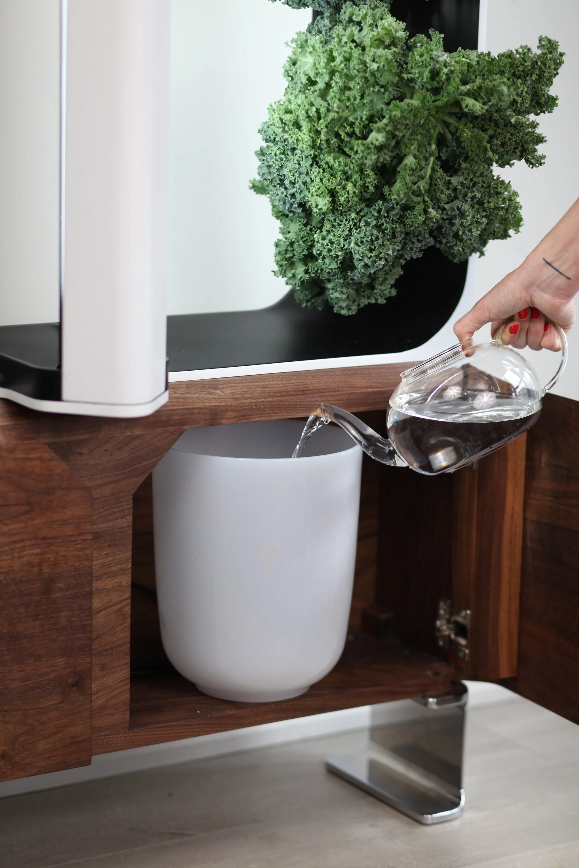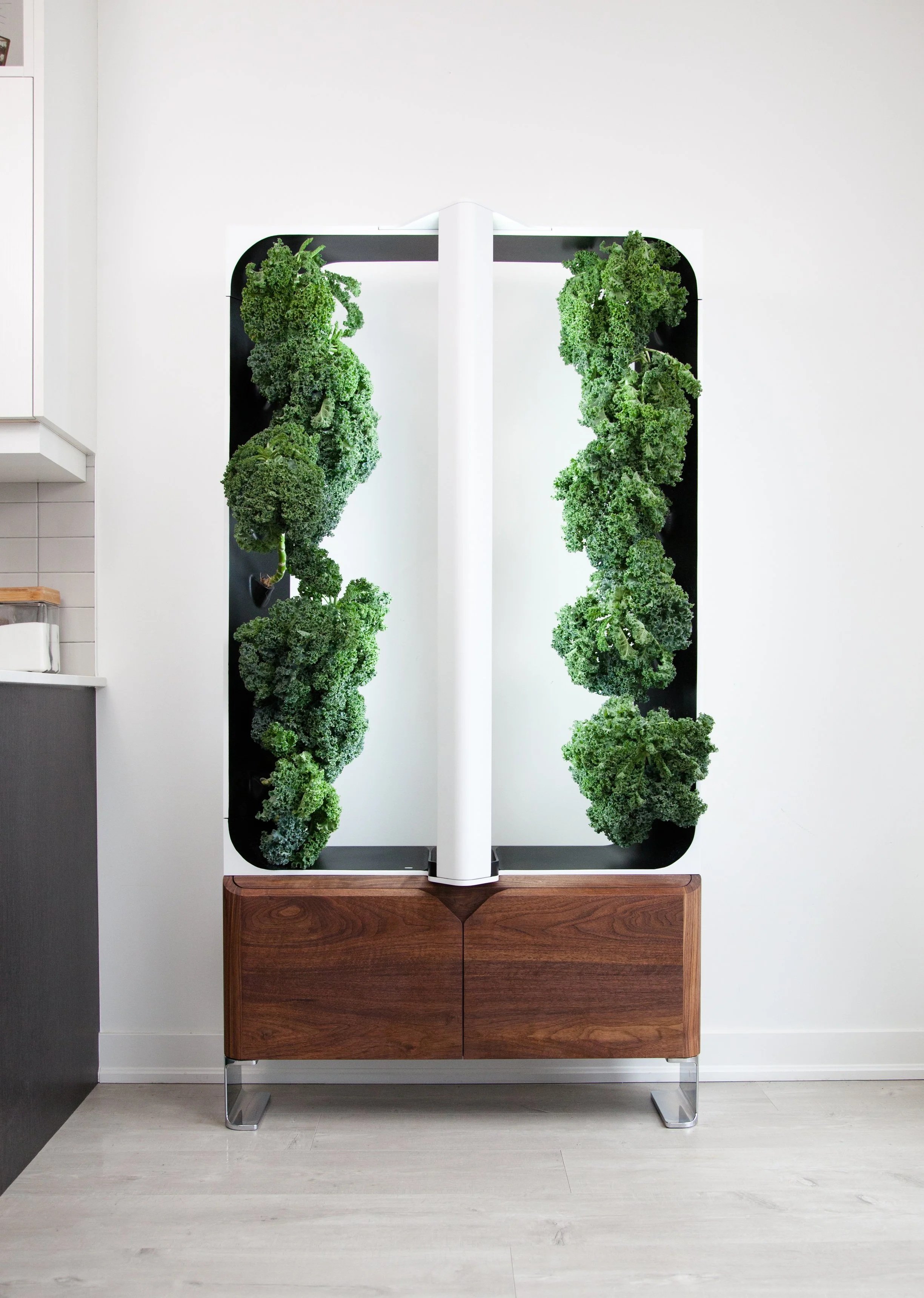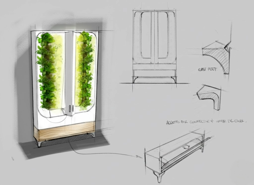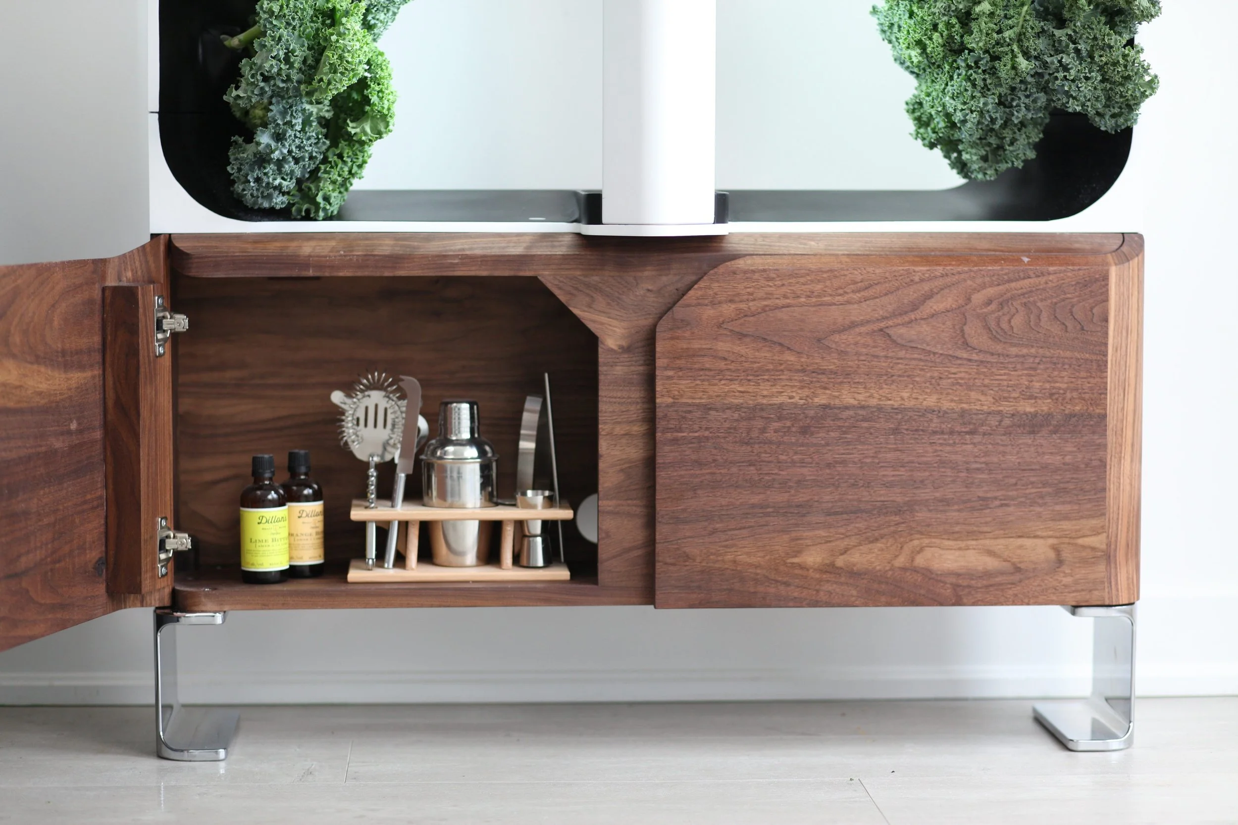 The design integrates a vertical garden alongside a slim, 8-inch deep credenza silhouette. This approach resolves complex agricultural requirements - automated watering, full-spectrum LED lighting, and a 12L reservoir - into a form that functions as a residential focal point rather than a science experiment. By using solid wood and stainless steal legs, the system sustains 16 plants while appearing as a natural element of the room.